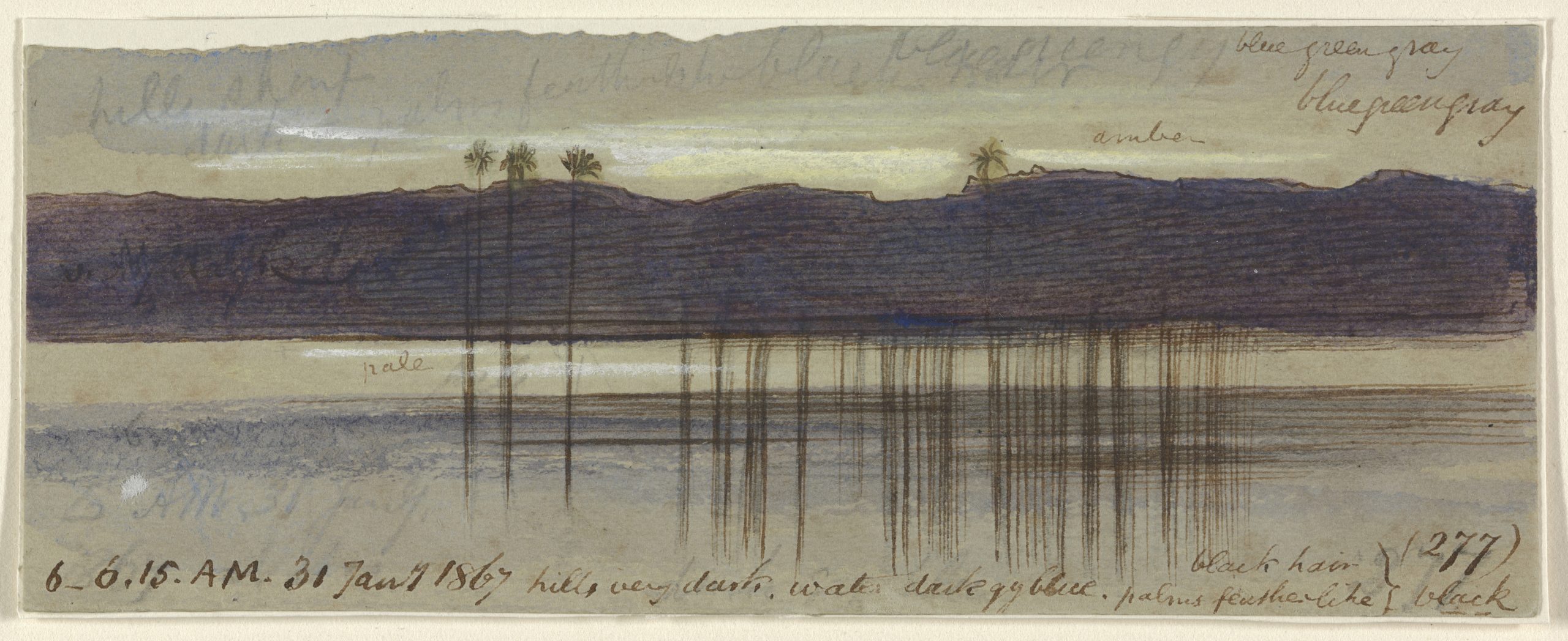 Despite the sizes not being to scale in Lear’s pieces. He does well to capture the landscape’s vastness. This is what I experienced when looking at the piece Lago D’ldra 1867. Before viewing this exhibition I wouldn’t have described landscape paintings as personal. But in the pieces Luxuar 7:00 am Jan 1867, Luxuar 7:30 am 1867 and many others. Lear offered me a way to connect with these pieces through their names.