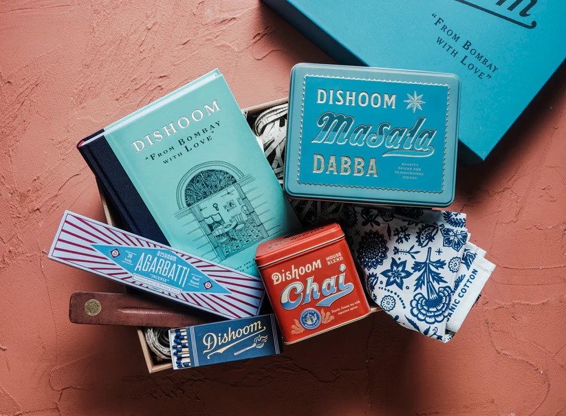 A grand selection of goods to cook Bombay comfort food in your own kitchen. Cramful with all manner of café favourites including the Dishoom Cookery Book, Masala Dabba, House Chai, cotton Tea Towel and signature Incense (with matches and a wooden holder). All housed in a sturdy blue hamper box. Dishoom Cookery Book (and highly subjective guide to Bombay) – an eccentric and charming cookery book, with over 100 recipes for the Bombay comfort food and drink that they love.