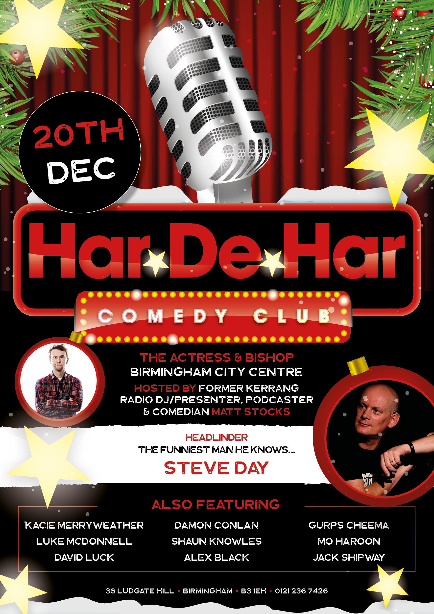 Hosted by former Kerrang host/DJ and podcaster to the stars Matthew Stocks headlined by Steve Day. With a local line up to laugh your Christmas party pants off too: Kacie Merryweather, Damon Conlan, Gurps Cheema, Luke Anthony Mcdonnell, Shaun Knowles, Mo Haroon, David SmileyFace Luck, Alex Black & Jack Shipway
