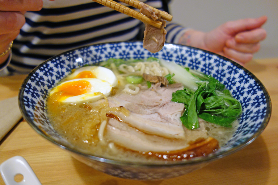 With drink and food menus in hand we choose a bottle of Asahi Super Dry Japanese Lager each and trace the menu for choices. This is an easy game as it’s a stripped down offering with three noodle bowls to choose from and four buns, all of which are equally enticing. This is my first experience of this type of fare and I can see the comfort and appeal as the bowls and buns go out to other diners.