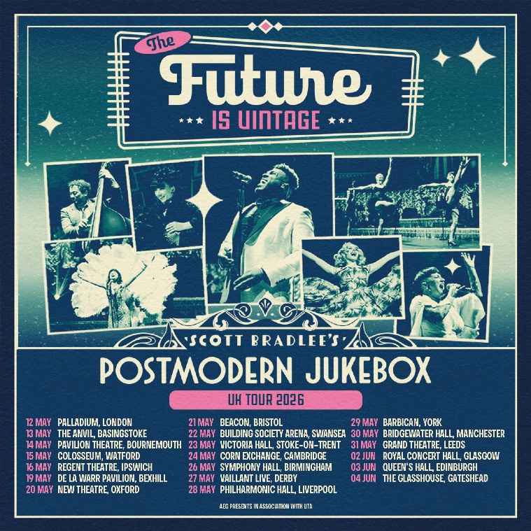 Postmodern Jukebox — the internationally acclaimed music collective famed for their signature time-twisting style, transforming some of our most loved songs into dazzling vintage masterpieces — has announced a brand-new 20-city UK tour for May and June 2026, as part of their globe-spanning The Future Is Vintage world tour.