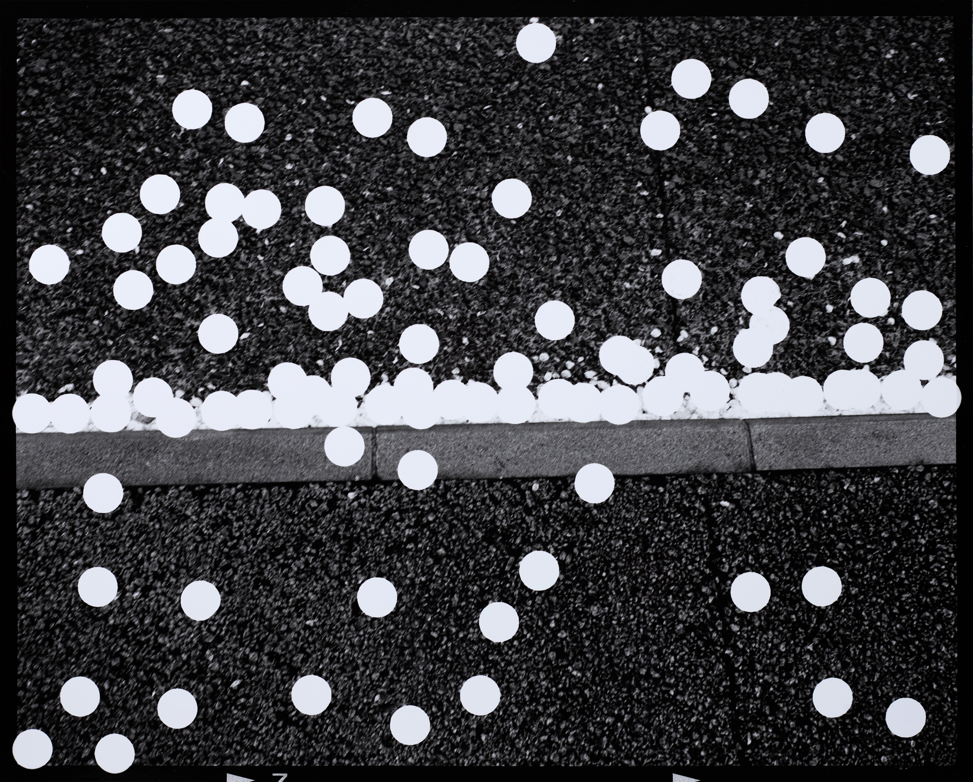 Intrigued by the abundance of scattered petals covering the pavements, Braine also made a series of only 17 black and white images that form the basis of 10,000 Fallen Petals. However, frustrated by the too descriptive nature of the images she applied tiny, Japanese stickers to the negatives, individually covering each one that had fallen to the pavement. For each blossom, a sticker; 10,000 in all. Wanting to create a sense of journey and passing time, she states: