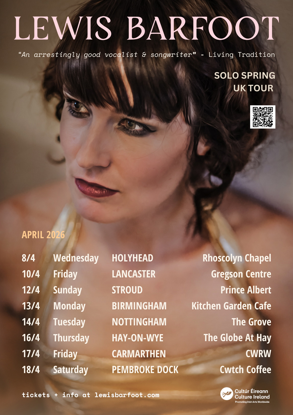 London Irish contemporary folk artist and singer-songwriter Lewis Barfoot takes to the road this spring for an eight-date solo UK tour supported by Culture Ireland, following her successful solo tour in November 2024.Featuring return performances at The Prince Albert, Stroud, The Kitchen Garden in Birmingham, CWRW in Carmarthen and Cwtch Coffee in Pembroke Dock alongside debut appearances including Nottingham, Lancaster and Hay-On Wye and Holyhead.
