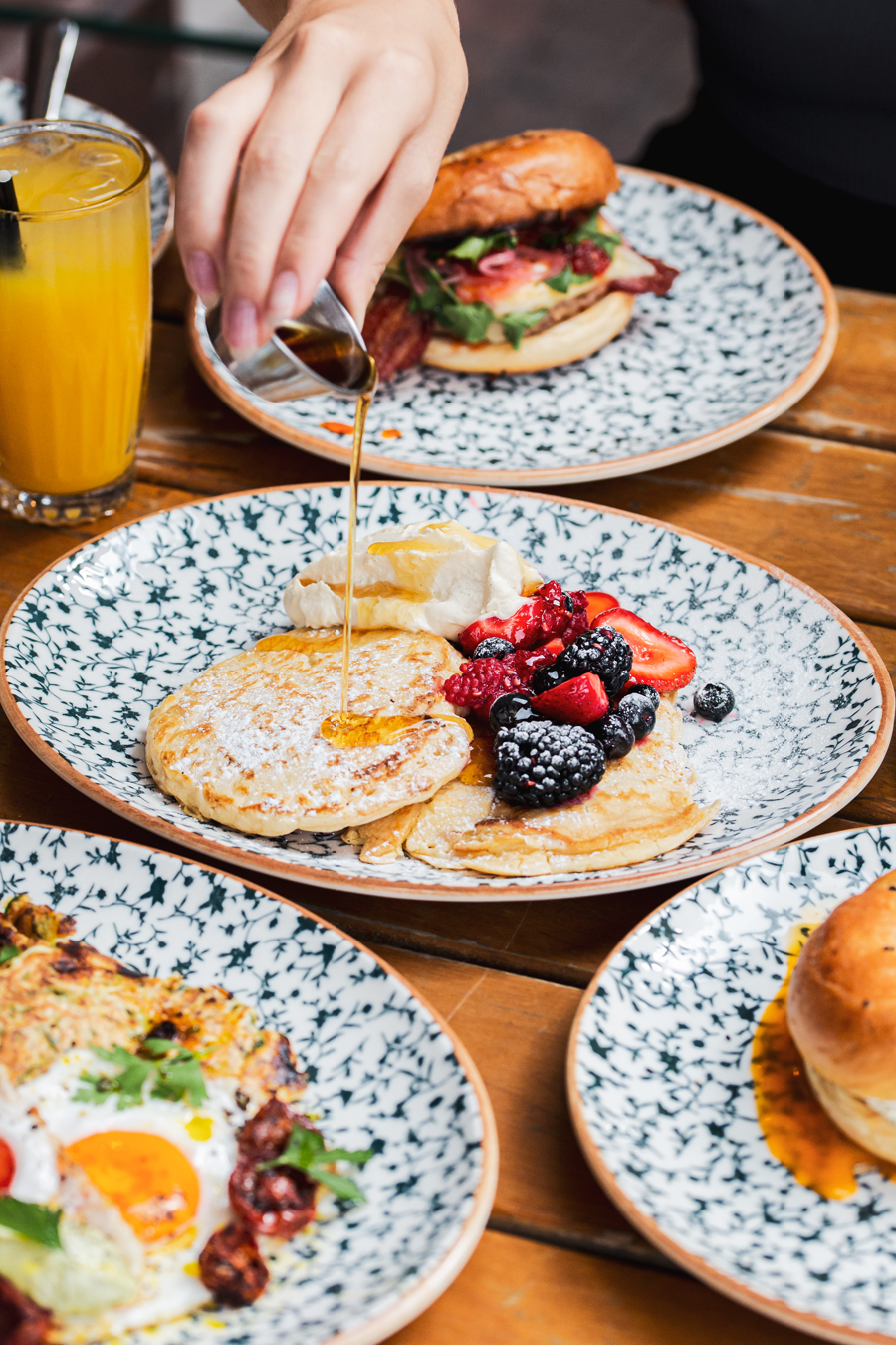Diners with a sweet tooth can opt for Pancake Haus, fluffy, sweet pancakes with maple syrup and either maple bacon and Burford brown egg or vanilla berries and cream.