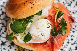 Other options include the Cook Haus Breakfast (Catherine wheel sausage, Yorkshire streaky bacon, Burford brown egg, roasted portobello mushroom, baked beans and hash brown), Veggie Cook Haus Breakfast (Moving Mountains sausage, smashed avocado, Burford brown egg, roasted portobello mushroom, baked beans, hash brown, roast tomato and Pain de Mie toast), Goats Cheese and Courgette Fritters (Burford brown eggs, Frankfurt sauce and spicy devilled tomatoes) and Smoked Salmon Bagel (chive cream cheese, poached Burford brown eggs and cress).