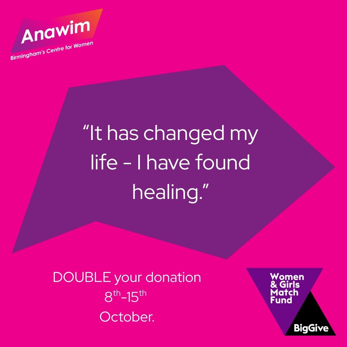 Anawim – Birmingham’s Centre for Women is taking part in the Big Give’s Women and Girls match funding campaign this October! We’re delighted to have been picked for this opportunity and are aiming to raise £5,000 – which will then be doubled – in just one week. This money will help us support women to leave abuse behind.
