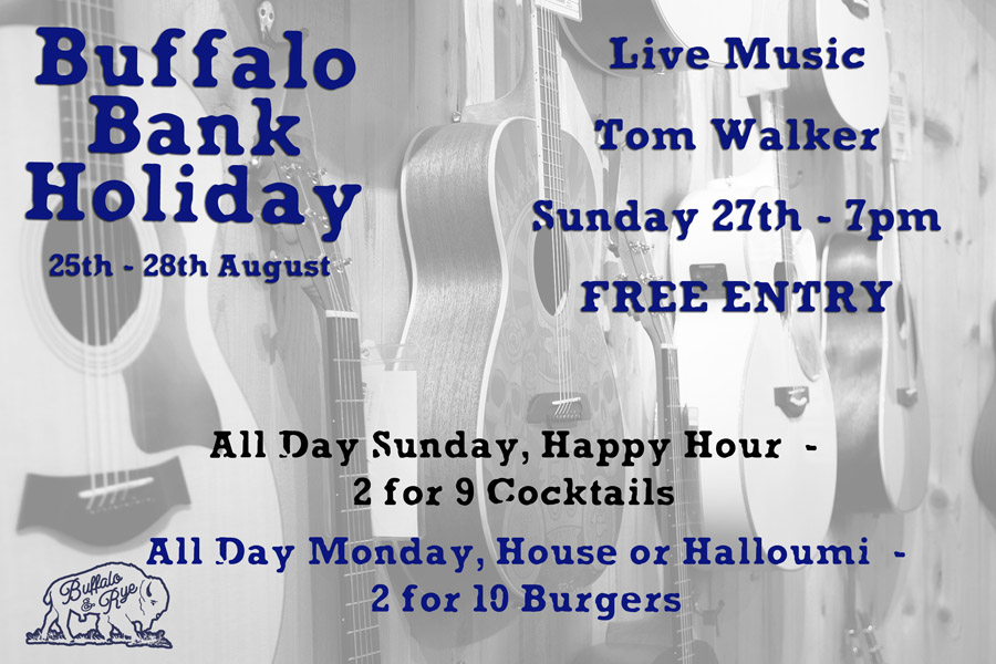 Buffalo and Rye will be hosting live music from Tom Walker on Sunday 27th from 7pm – Plus all day and night on Sunday it is 2 for £9 on all happy hour cocktails.