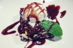 A Triple Chocolate Brownie served warm with chunks of chocolate, topped with chocolate toffee sauce and vanilla ice cream was rich and filling, and what an awesome combination. This we shared between us and it melted into a mess which was virtually licked clean off the plate.