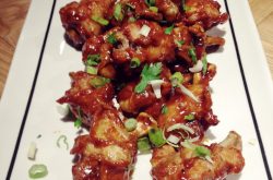These were crispy and coated with a slightly spicyTabasco raspberry chipotle sauce, served with sour cream dip. They arrived piping hot!