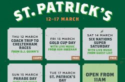 St. Patrick’s at D.J. Quinn’s takes place from Thursday, March 12th to Tuesday, March 17th. Tickets for the Coach Trip to Cheltenham Races are £20pp and available from Eventbrite. All other events are free entry.