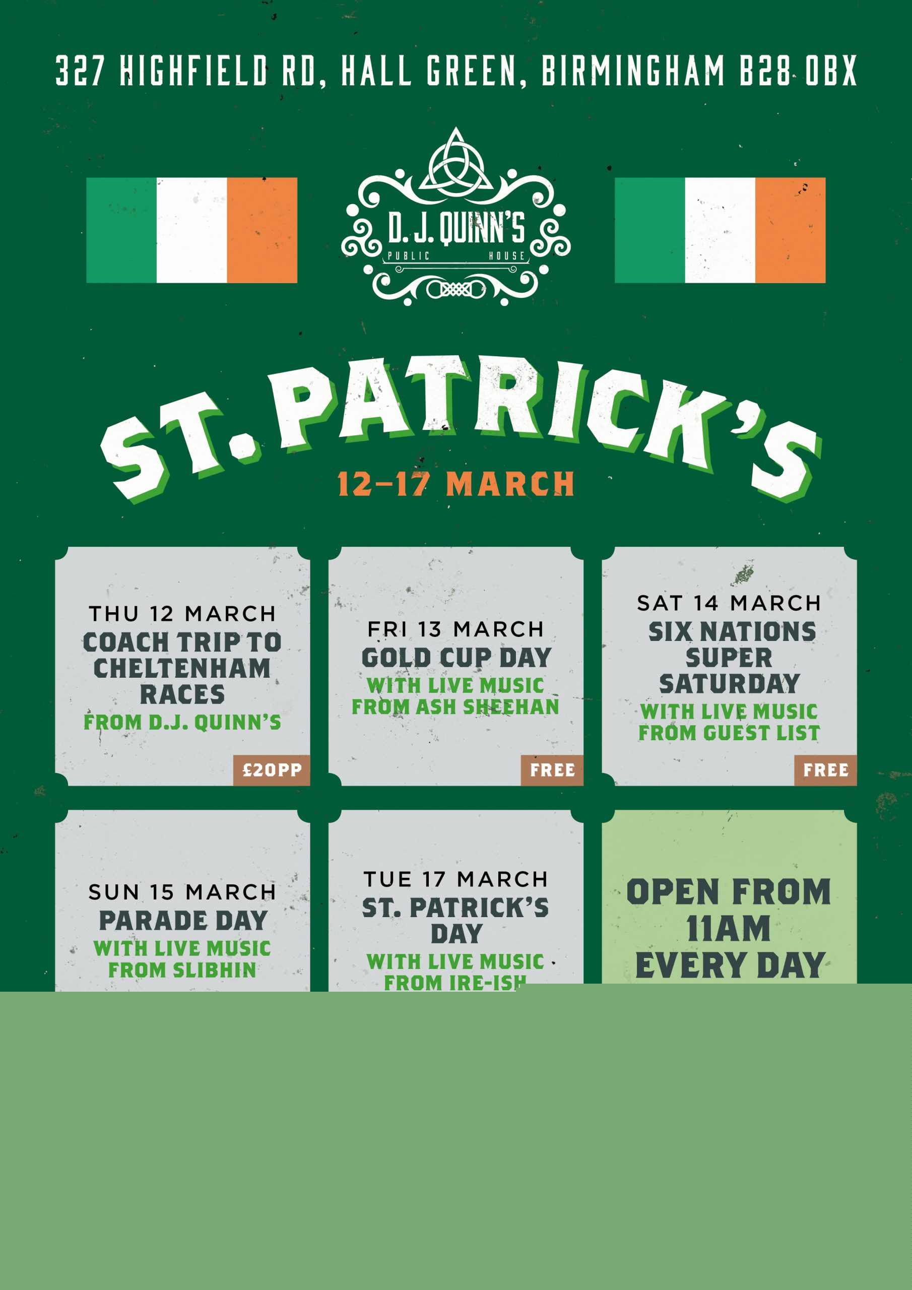 Based in Hall Green, D.J. Quinn’s is well known for its sports screenings and weekends filled with Irish music and craic. From Thursday, March 12th to Tuesday, March 17th, the pub has coach trips, live music and Super Saturday events up their sleeves to celebrate the Irish festival.