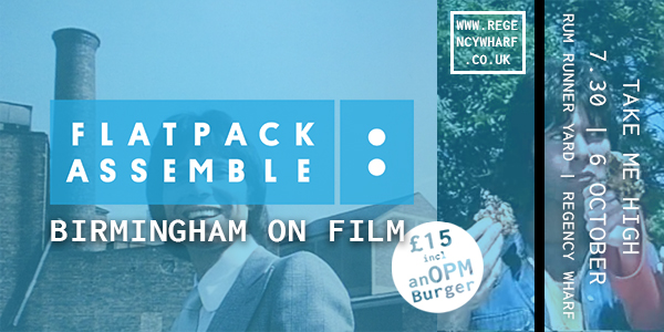 Ian Francis, Flatpack Film Festival – ”Birmingham on Film is all about taking rare archive film to unusual locations, so we’re delighted to be working with Regency Wharf. It pops up in a number of our films: back when it was the Rumrunner this corner of the city was the backdrop for cult TV show Gangsters, and just across the water Cliff moored his narrowboat for Take Me High. I hope this is the first of many outdoor screenings at RW – Rum Runner Yard.”
