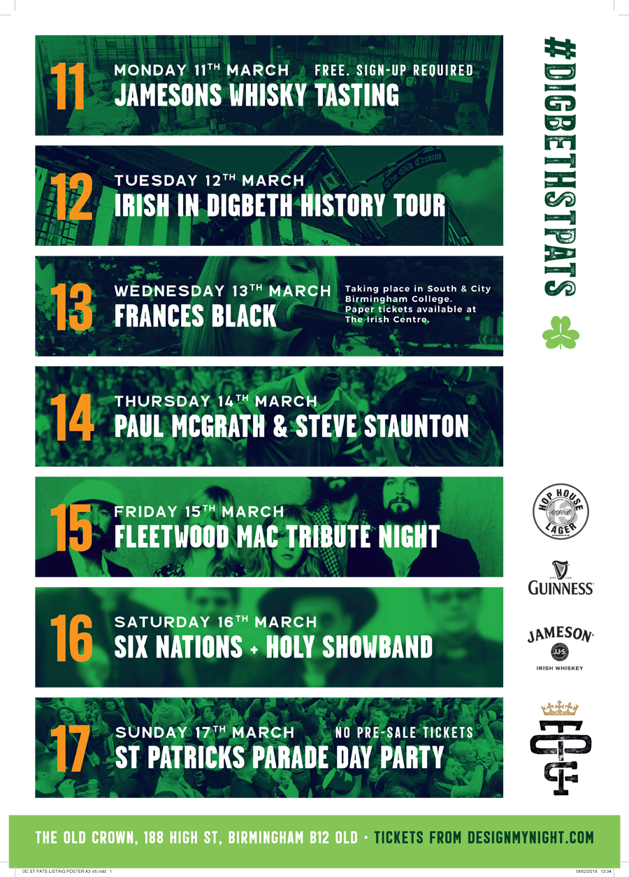 Tickets for The Old Crown’s Digbeth St. Pats’ Week are available on Design My Night. Tickets for Sunday’s St. Patrick’s Parade Day Party are available on the door.