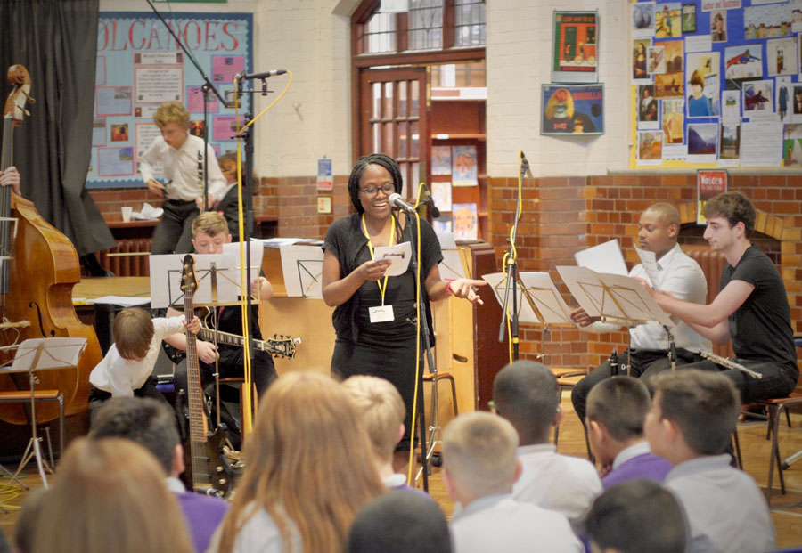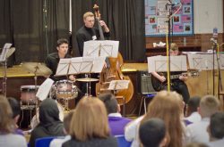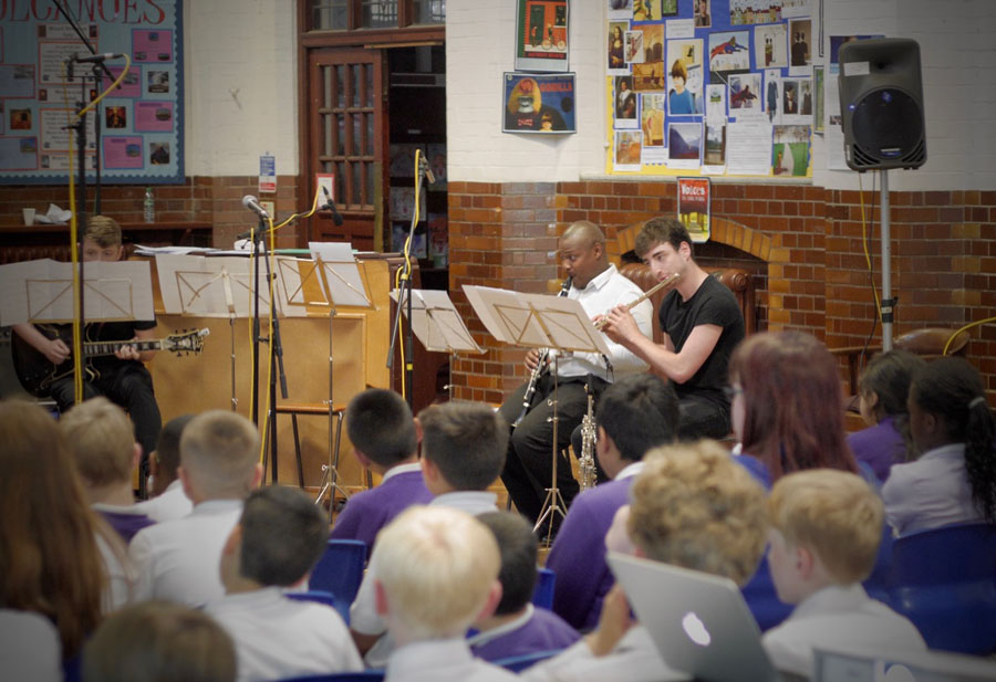 The Leap Ensemble played a light and uplifting piece on Clarinet, Double Bass, Guitar, flute and saxophone called ‘Birdy’. They followed this with a tipsy sounding piece ‘Down the Canal’. Next, they were joined on stage by Billesley Primary School who performed a jaunty piece.
