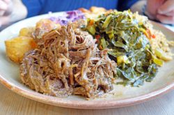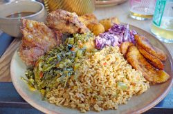 Cajun Soul’s gravy was perfect for dipping the roast potatoes in too, which I am told, are boiled, fluffed up, fried and then shaken up with salt, rosemary and lemon pepper seasoning. The dipping helped soften the outer crust. I can imagine some people may find these a bit too hard to bite into without the gravy – though I personally prefer roasties done that way. Perhaps a little less well done to please all?