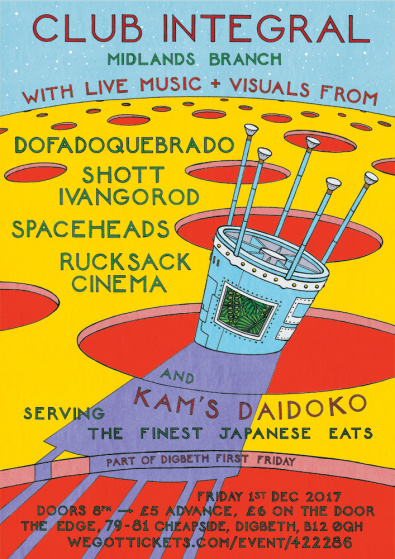 The Edge: Club Integral Midlands Branch – Spaceheads, Rucksack Cinema, Dofadoquebrado, Shott Ivangorod (LARVA), 8pm – late Head to The Edge, as part of Digbeth First Friday, where Club Integral Midlands Branch, Dofadoquebrado, Shott Ivangorod (LARVA), Spaceheads and Rucksack Cinema promise an audio-visual spectacular! And for the first time at The Edge, Kamura of Kamura Obscura, who oft welcomes you at the door, will instead be serving very reasonably priced Japanese deliciousness from Kam’s Daidoko.