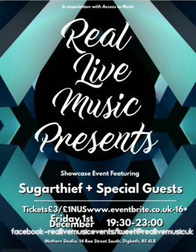 Muthers Studio: Real Live Music Events, 7.30 – 11pm Head over to Muthers Studio in Digbeth, where they will be hosting a showcase gig/networking event for the Indie Band, Sugarthief. Experience the new indie band’s showcase gig in an intimate stylish studio setting, with a fully licensed bar (over 16s only). Please check out their music at www.sugarthief.co.uk. The band will be supported by students from Access to Music in Digbeth and it is a chance to get their music heard by new fans. The band are currently unsigned. Tickets available at www.RealLiveMusic.EventBrite.co.uk, limited availability on the door on the night.