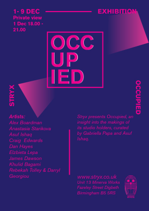 Stryx: Arma Agharta, OCCUPIED – Holders show, 6 – 9.30pm Stryx presents Occupied, an insight into the makings of its studio holders, curated by Gabriella Papa and Asuf Ishaq. This unique opportunity allows those to experience the space in situ; in celebration and collaboration with its multidisciplinary artists that have been in the midst of work throughout 2017. Studio holders come from diverse backgrounds and practices, expressing this eclectic mix within the space, while also taking inspiration from their surroundings to which their practice inhabits. Stryx welcomes you to chat to the up and coming artists that have been occupying the West Midlands.