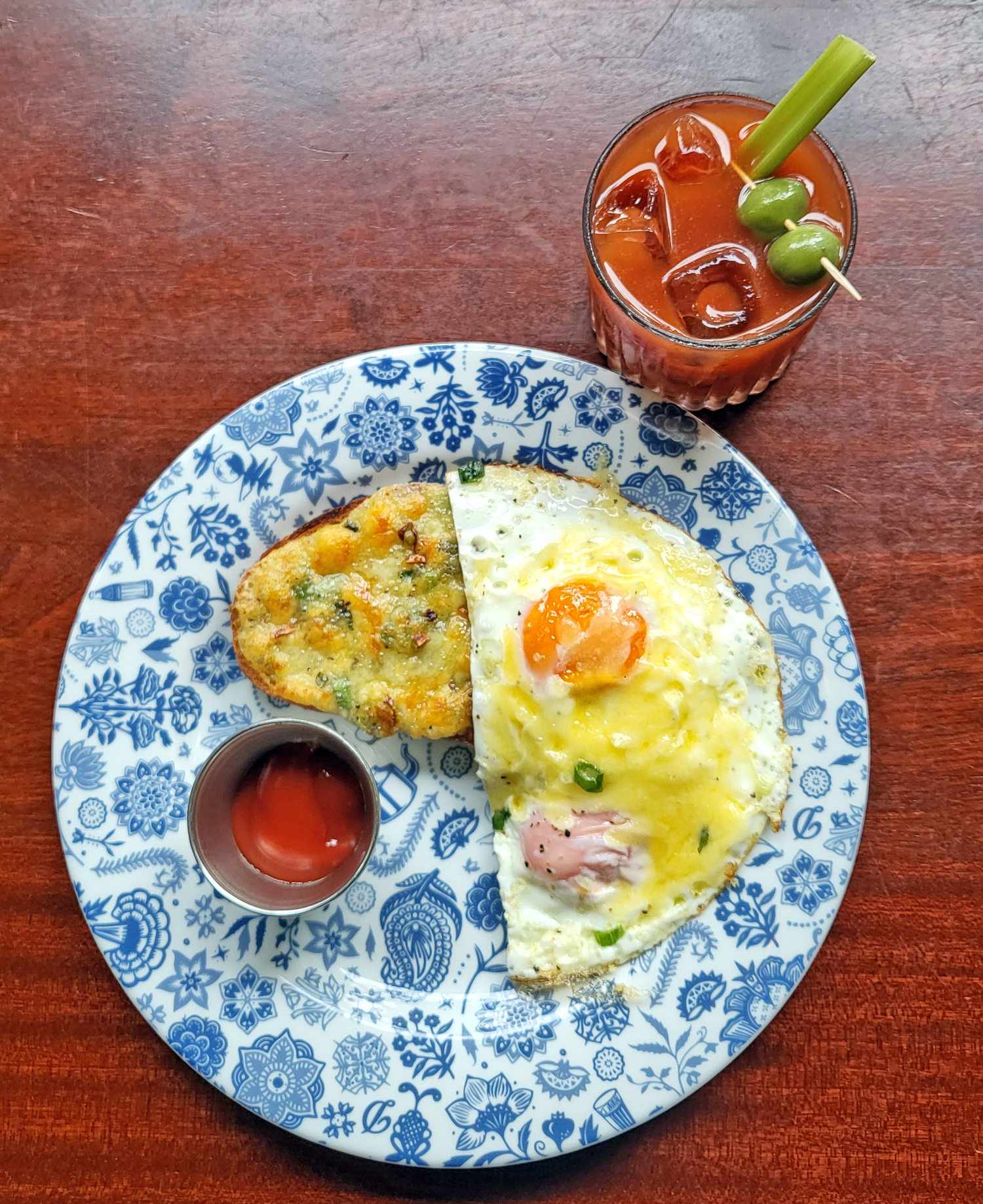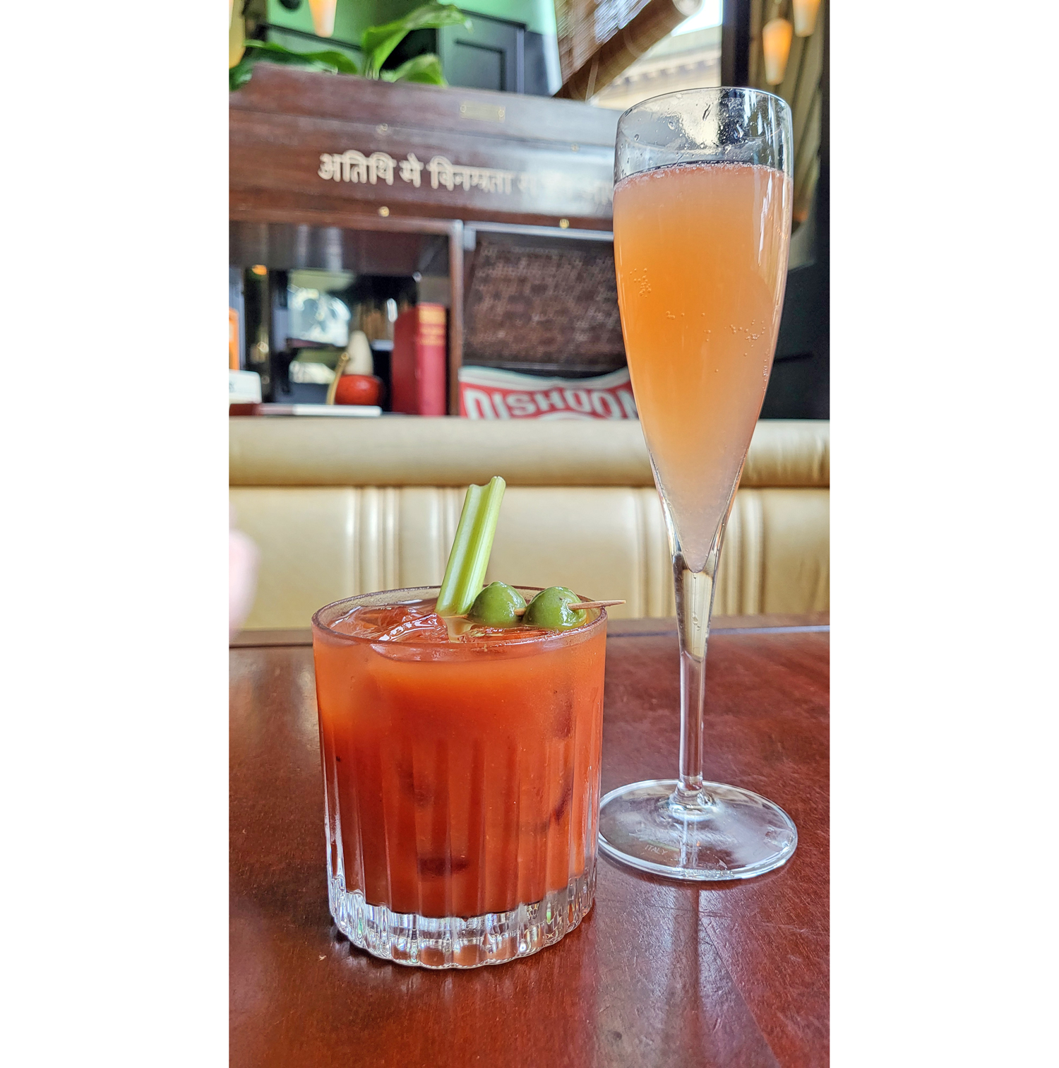 Seated in a booth that allowed us to face out and take in all angles of the lovely relaxed dining space and just catching the breakfast menu before the kitchen flipped over to their all day offering at 11:45am, we opted for the Christmas Breakfast Special, a Bacon & Brie Naan Roll, paired with a Bloody-Gosh Mary from the cocktail menu, and a Kejriwa from the breakfast menu, accompanied by a Marmalade Mimosa, Dishoom’s Christmas Cocktail Special.