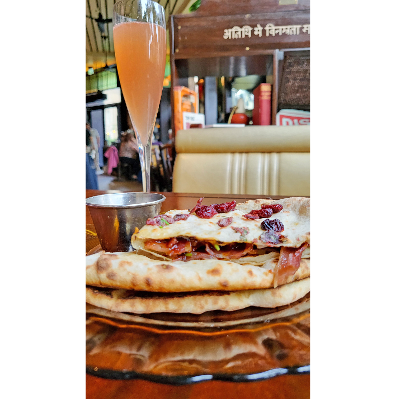 The Bacon & Brie Naan Roll is as comforting a site as it is to eat; Lusciously soft and plump naan bread with a dusty tandoor char, encasing smoky streaky bacon, creamy brie and cranberry-chilli chutney, giving each mouthful a lovely seasonal sour-sweetness. The warming heat and makhani sauce of the delicious Bloody Mary worked perfectly with this dish, shaking each other’s hands in a savoury show off.