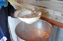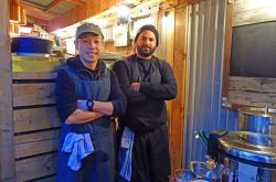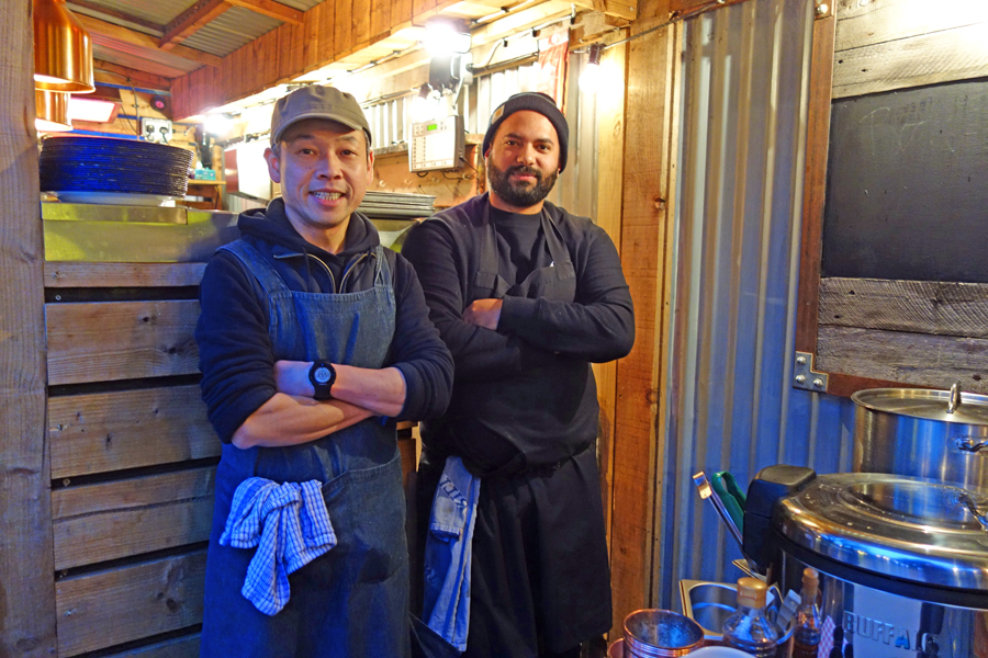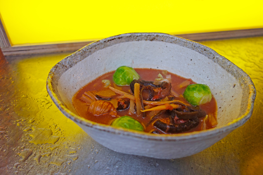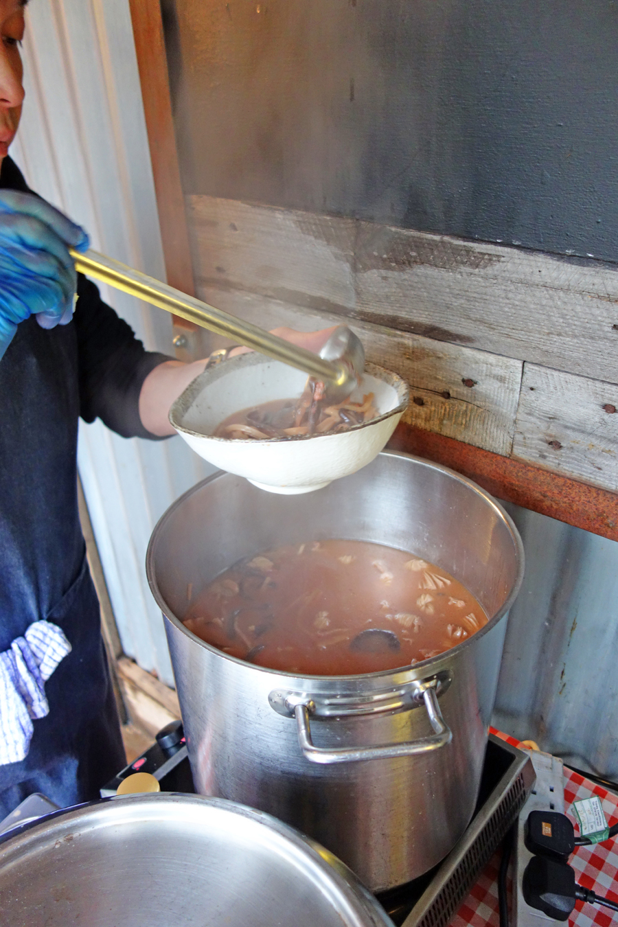 Ming was curating a busy kitchen outside. Staff were quickly arriving with orders, there was high demand for the dishes whilst I was there. Inside space was at a premium, so I sat at one of the carefully laid beer garden tables which were covered from the rain, thoughtfully adorned with menus and rolled up blankets to keep away the cold.