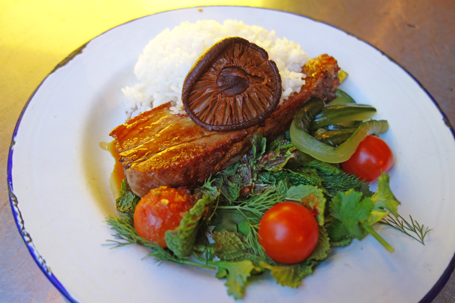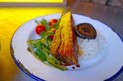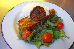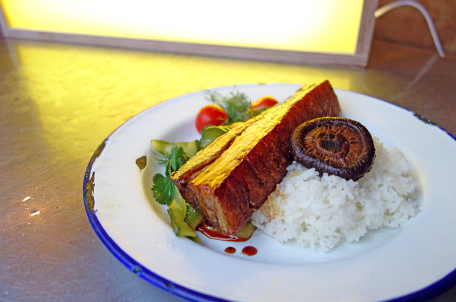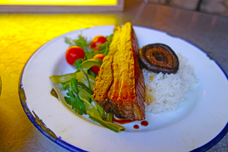 A large pickled Shiitake mushroom crowned this Vietnamese plate of glory, and had the most incredible intense taste. It was presented beautifully on top of the pork, and slightly sticky rice. Beneath this, the pork looked succulent and was cooked to the finest perfection, a deliciously soft belly attached to the most crunchy outer skin – what a combination. The long wedge of pork belly was easily cut, it was juicy, and soaked up sauce, which, just added to the explosion of taste.