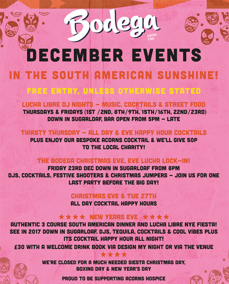 The Bodega Christmas Eve, Eve Lucha Lock-in! What have you planed for the Christmas Eve, Eve this year? Here at Bodega, it’s going to be the fiesta down in Sugar Loaf with Happy Hour all night long from 8pm! A big South America style party before THE big day!