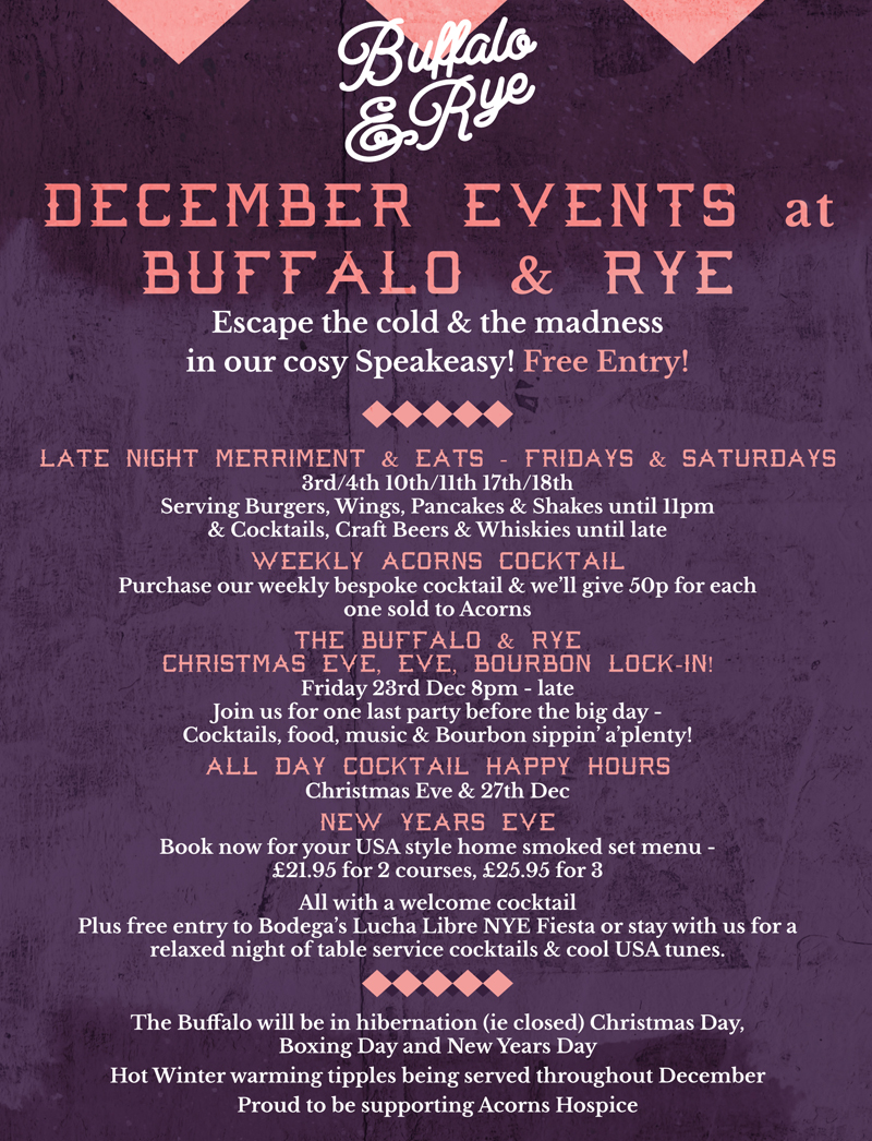 The Buffalo & Rye Christmas Eve, Eve Bourbon Lock-In – Join us for the last party before the big day! What’s on the menu? As usual our proper comfort food and stunning handcrafted cocktails for an evening full of American flavours!
