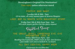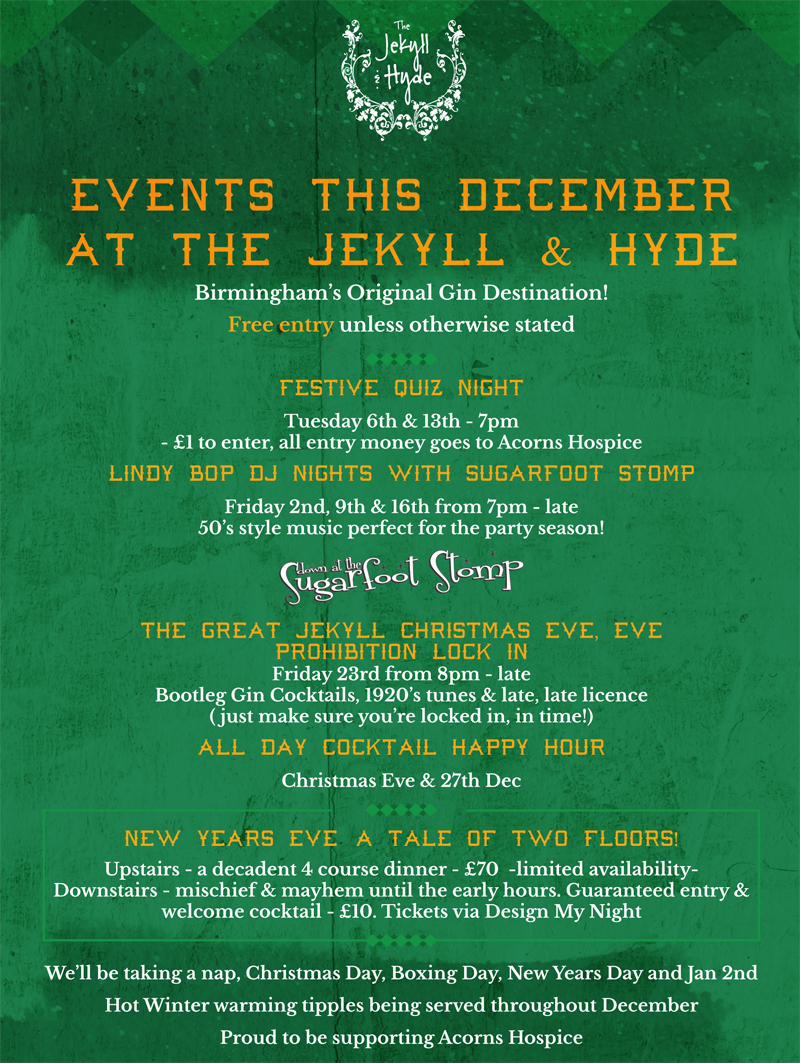 The Great Jekyll Christmas Eve, Eve prohibition lock-in – Join us from 8pm on Friday 23rd December before the BIG day and enjoy delicious bootleg gin cocktails and 1920’s tunes all night long as we have a late, late license ! (just make sure you’re locked-in in time!)
