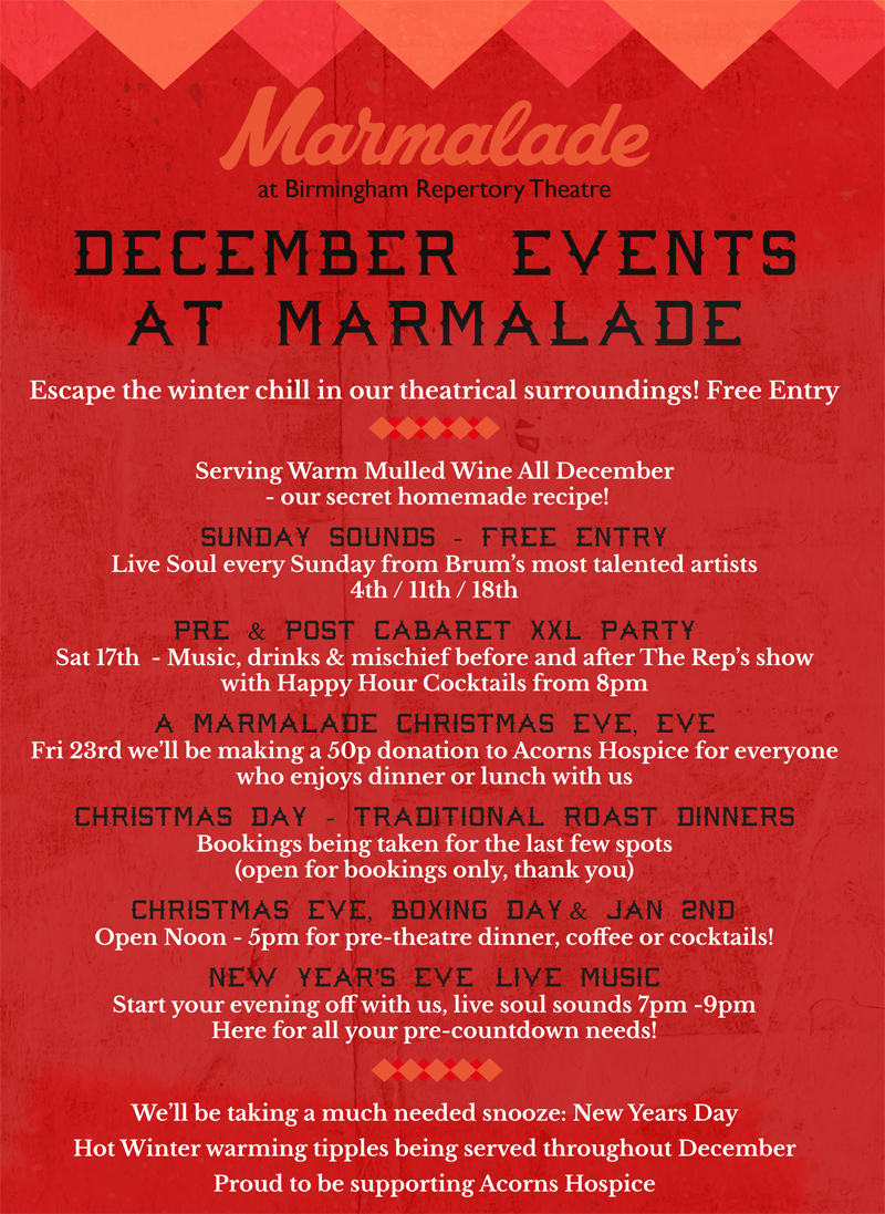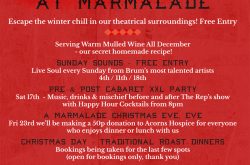 A Marmalade Christmas Eve, Eve – Join us on Friday 23rd as we will be making a 50p donation to Acorns Hospice for everyone who enjoys dinner or lunch with us!
