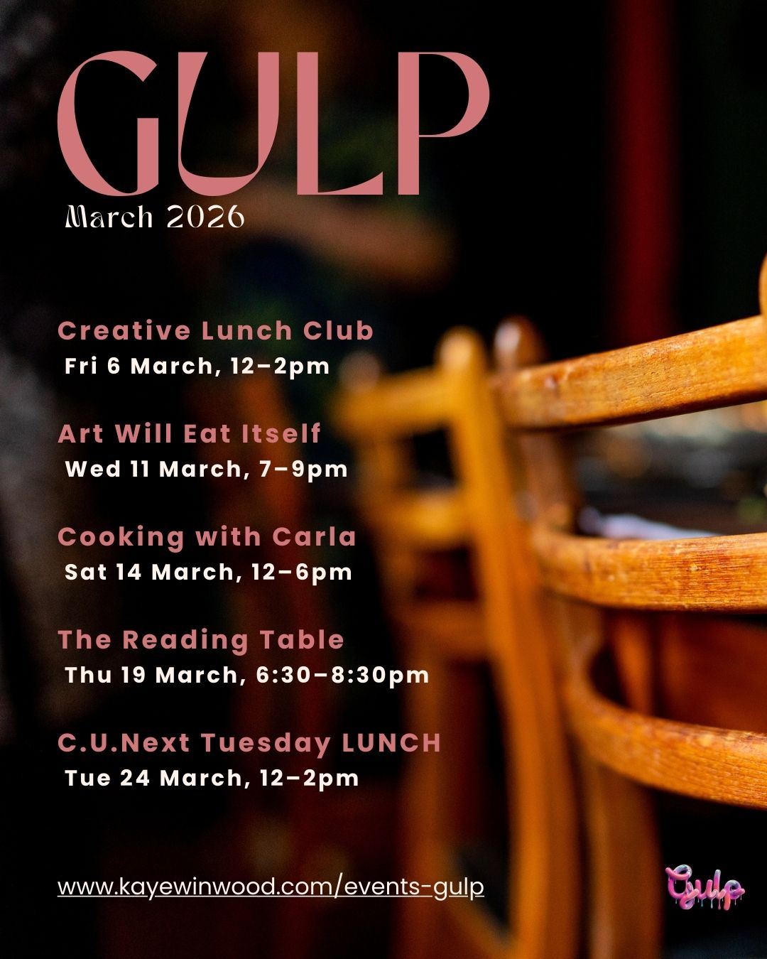 Every event is about curiosity, connection, and experimenting with flavours, ideas, and conversations. I’d love to see you around the table — your presence helps make GULP the joyful, creative space it is and supports small, independent venues like ours to thrive.