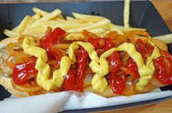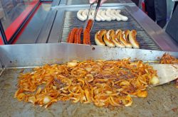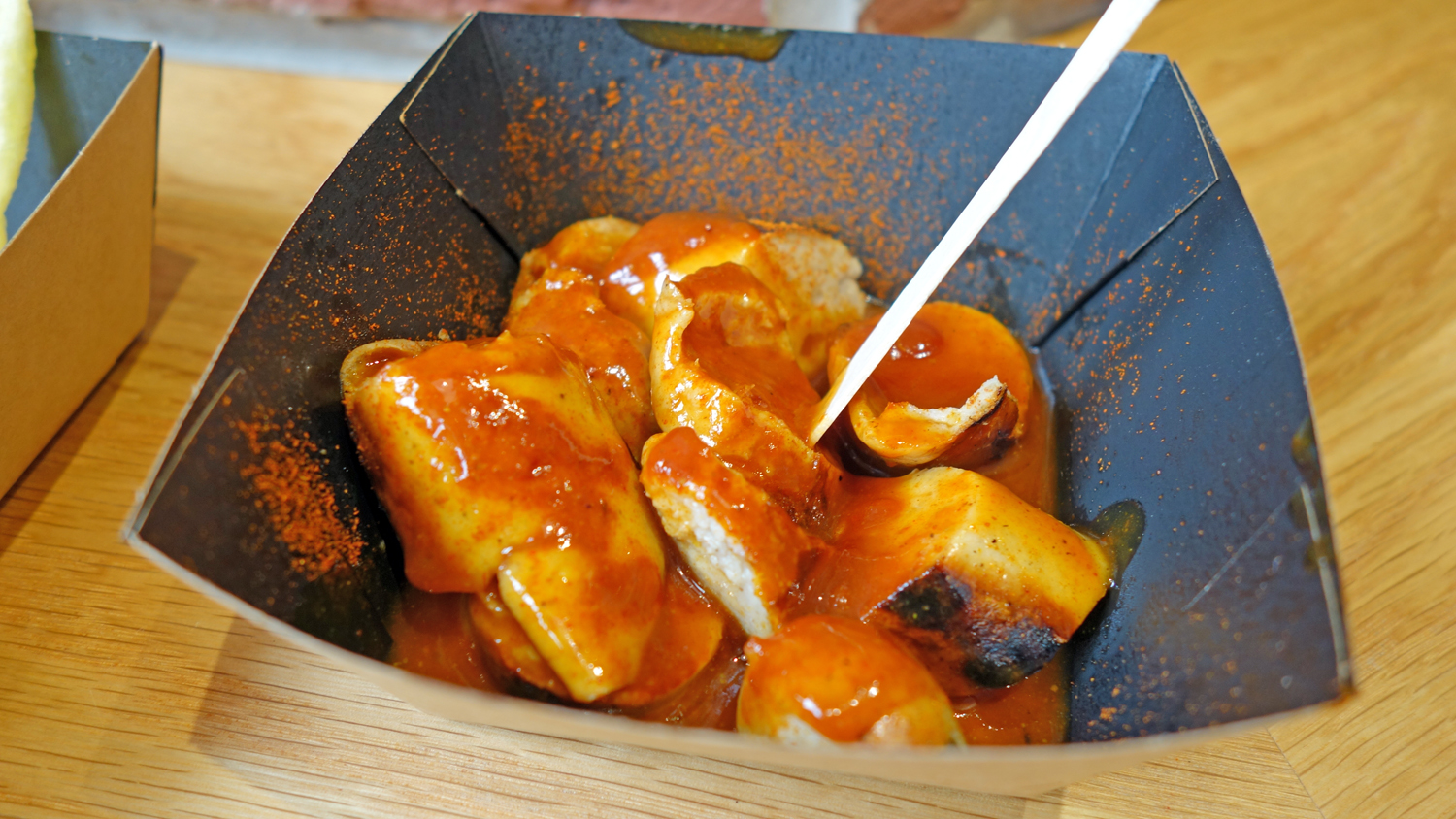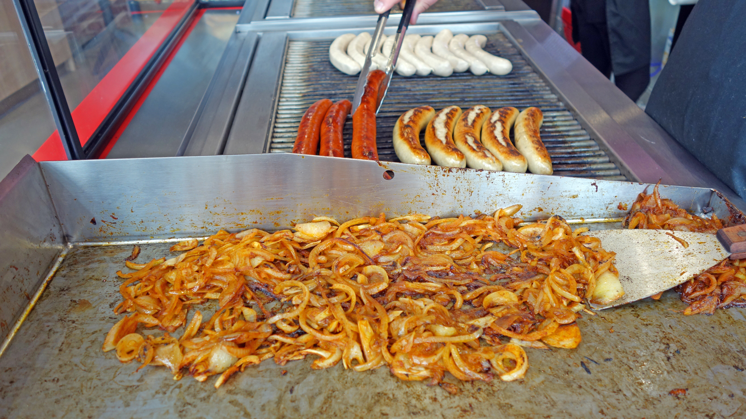 After a quick nose at the two types of sausages being grilled (red and white) I decided on a white bratwurst with glazed onions in bread, with fries, tomato sauce, mustard and a side of currywurst.