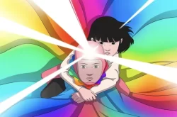 What if rainbows were actually time travellers from the future flying using multi-coloured suits? That’s the premise behind this French hand-drawn, two-dimensional style animated children’s eco fable with its Hayao Miyazaki influences in which, set in an idyllic 2932 where humans live in floating homes in the sky, ten-year-old Arco (Juliano Valdi) is jealous that his parents (America Ferrera, Roeg Sutherland) and older sister travel through time, but he’s forbidden until he’s twelve. So, one night,. He steals his sisters cape and the gemstone that enables him to fly and attempts to go back in time to see dinosaurs. Instead, he ends up crash landing in 2075 where robots do most of the work and extreme weather events are the norm and homes are protected by bubbles. He’s discovered by Iris (Romy Fay), a girl of the same age, who along with her infant brother Peter are looked after by a robot caretaker called Mikki while their parents (Mark Ruffalo, Natalie Portman who also voice Mikki) work in the city, the two bonding (arcoiris is Spanish for rainbow), she finding the friendship she needs, but with Arco unable to return home as he can’t fly unless there’s rain and sunshine at the same time.