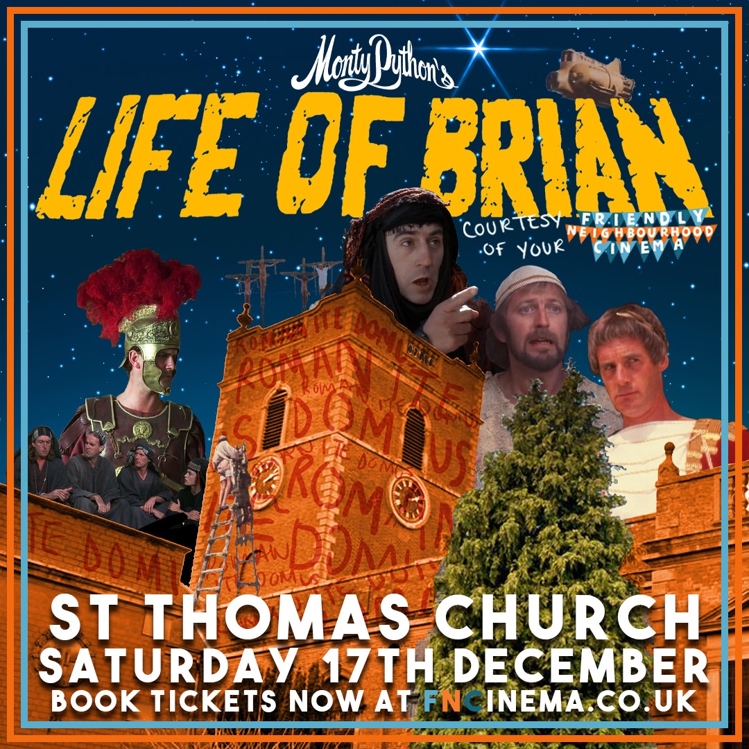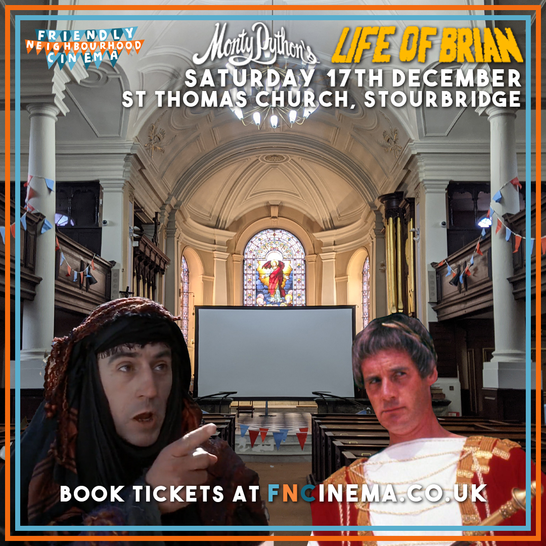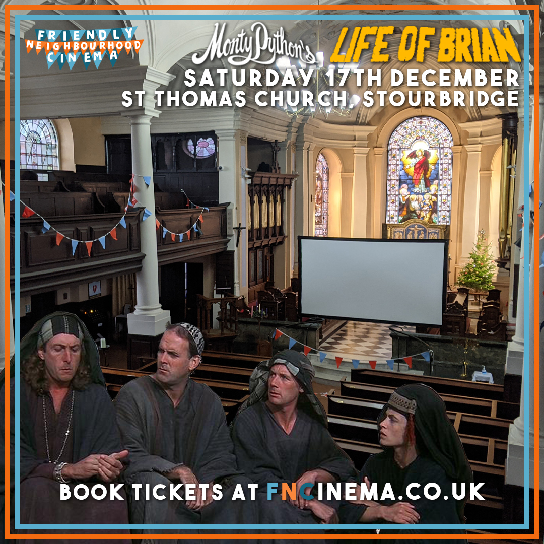 Independent Stourbridge pop-up, Friendly Neighbourhood Cinema presents Monty Python’s anarchic, religious satire LIFE OF BRIAN screening inside of Stourbridge’s beautiful St Thomas’ Church on Sat 17th December, 6pm. Tickets and more info available at www.FNCinema.co.uk