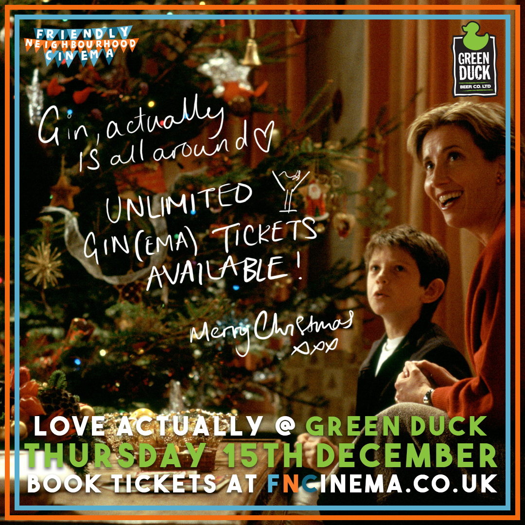 Richard Curtis’ Pulp Fiction: there, someone said it. Friendly Neighbourhood Cinema returns to Green Duck brewery for a special GINEMA screening of Curtis’ Christmas romcom-megasaurus, LOVE ACTUALLY. Pure distillation of British wit and problematic yet endearing mismash romantic tropes that only gets better with Gin!