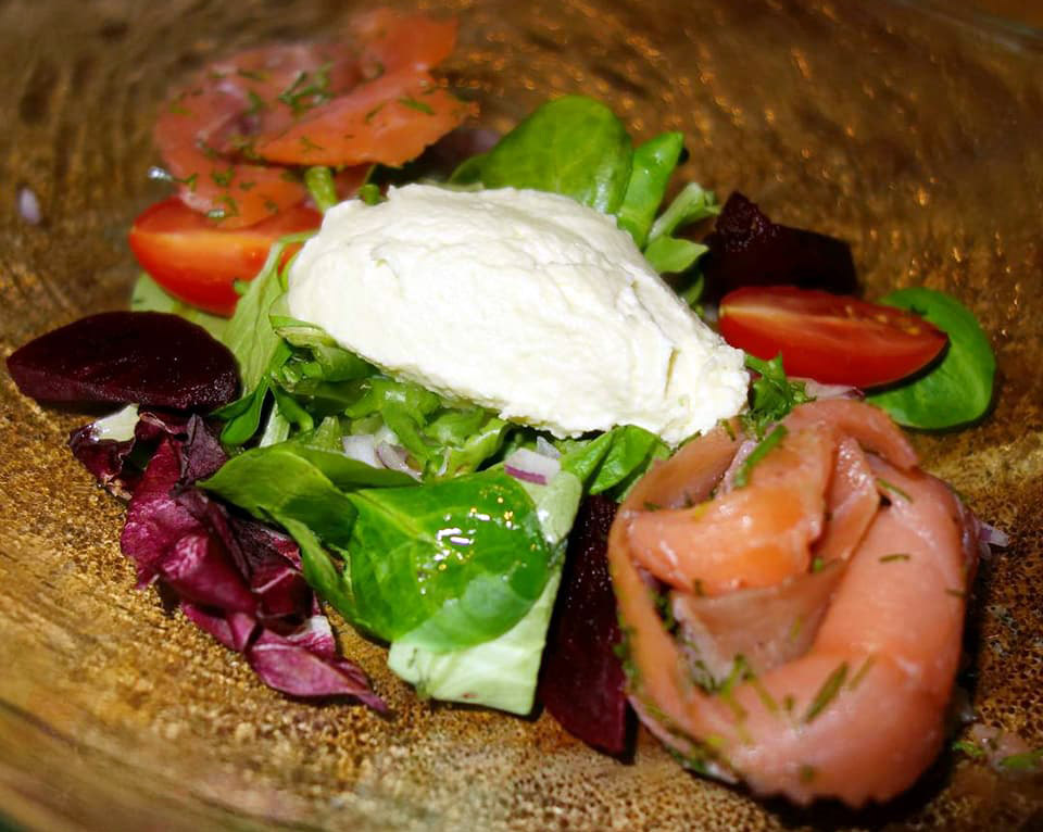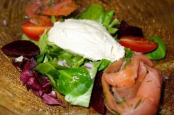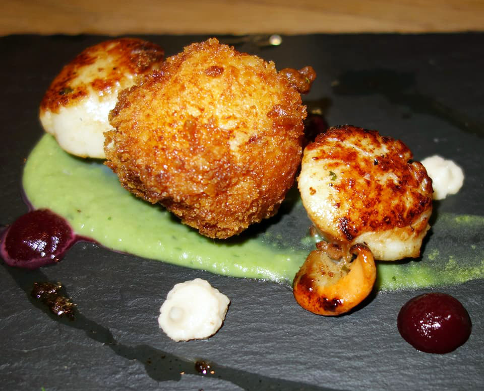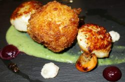 First up is Scallops Nduja with a smear of pea and cauliflower. This cooked to perfection, tender with a slightly crispy crust, the pea and cauliflower, compliment the scallops, and prepare us for the Salmon Gravadlax, which is served with wasabi, lemon and beetroot.