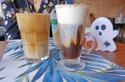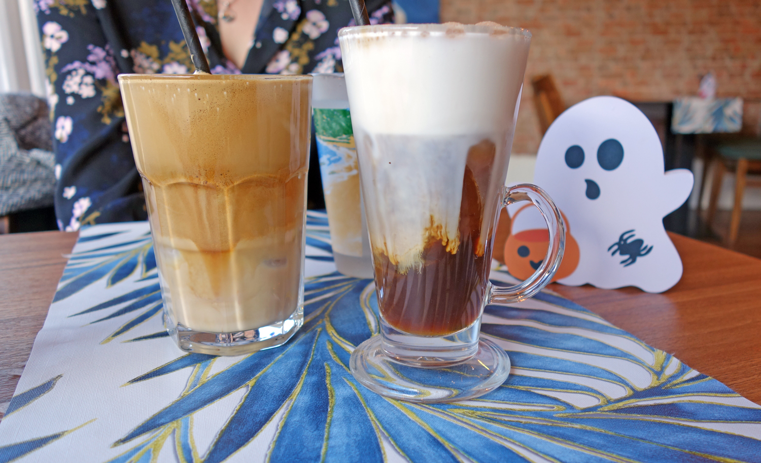 We ordered a selection of starters and traditional dishes and even iced coffees taking advantage of the warmer weather. I think my favourites were the feta spring rolls with spinach (delicious filo pastry parcels) as well as the hummus and flat bread. Now I know that last one sounds very basic but the fact that I remember it proves just how tasty it was. We were also recommended to try the olives as well as the Greek feta with olive oil and oregano dip, the latter was a fantastic accompaniment to the lamb and remaining pita.