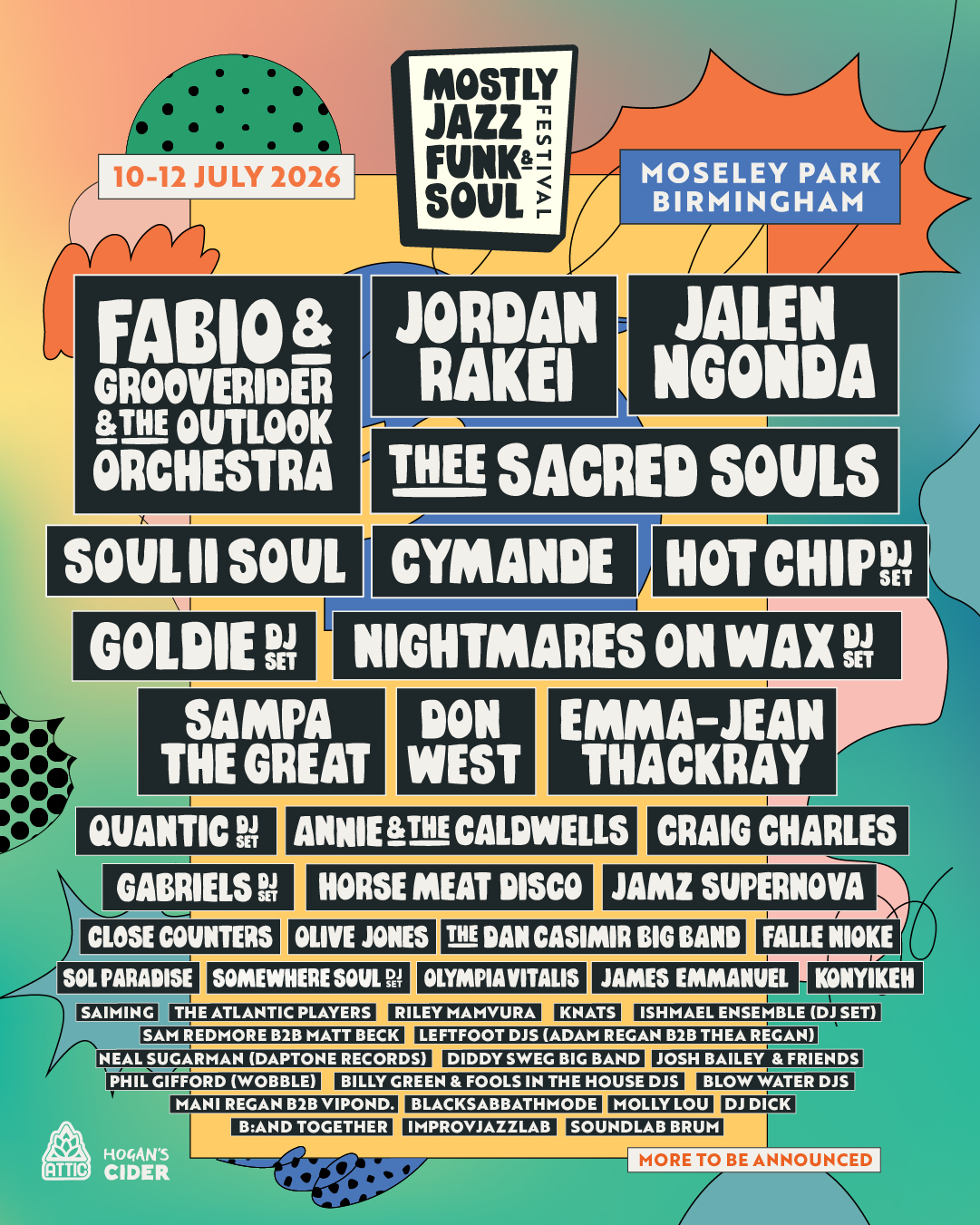 ◼ Mostly Jazz Funk & Soul Festival runs from Friday 10 to Sunday 12 July 2026 at Moseley Park, Birmingham. Tickets back on sale from Friday 27 March 2026, 10am (with Tier 3 tickets now strictly limited). For full details, including day splits, see: mostlyjazz.co.uk