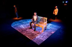 The production is simple, a wooden bench sitting on an illustration depicting scenes from the city in the shape of an arched window; a window onto the city and the lives of the people who live in it, just as the play is a small opening into the lives of the three characters.