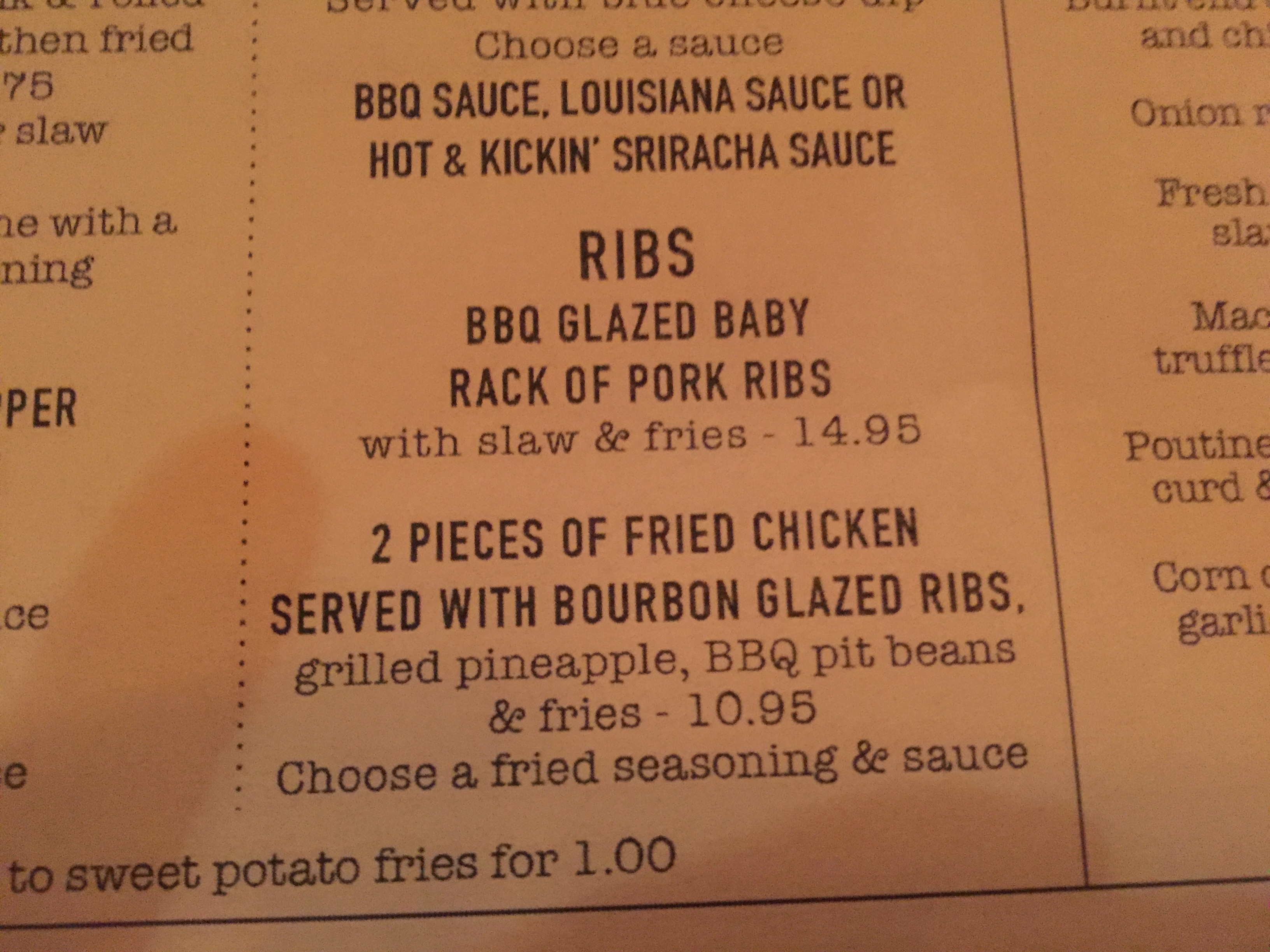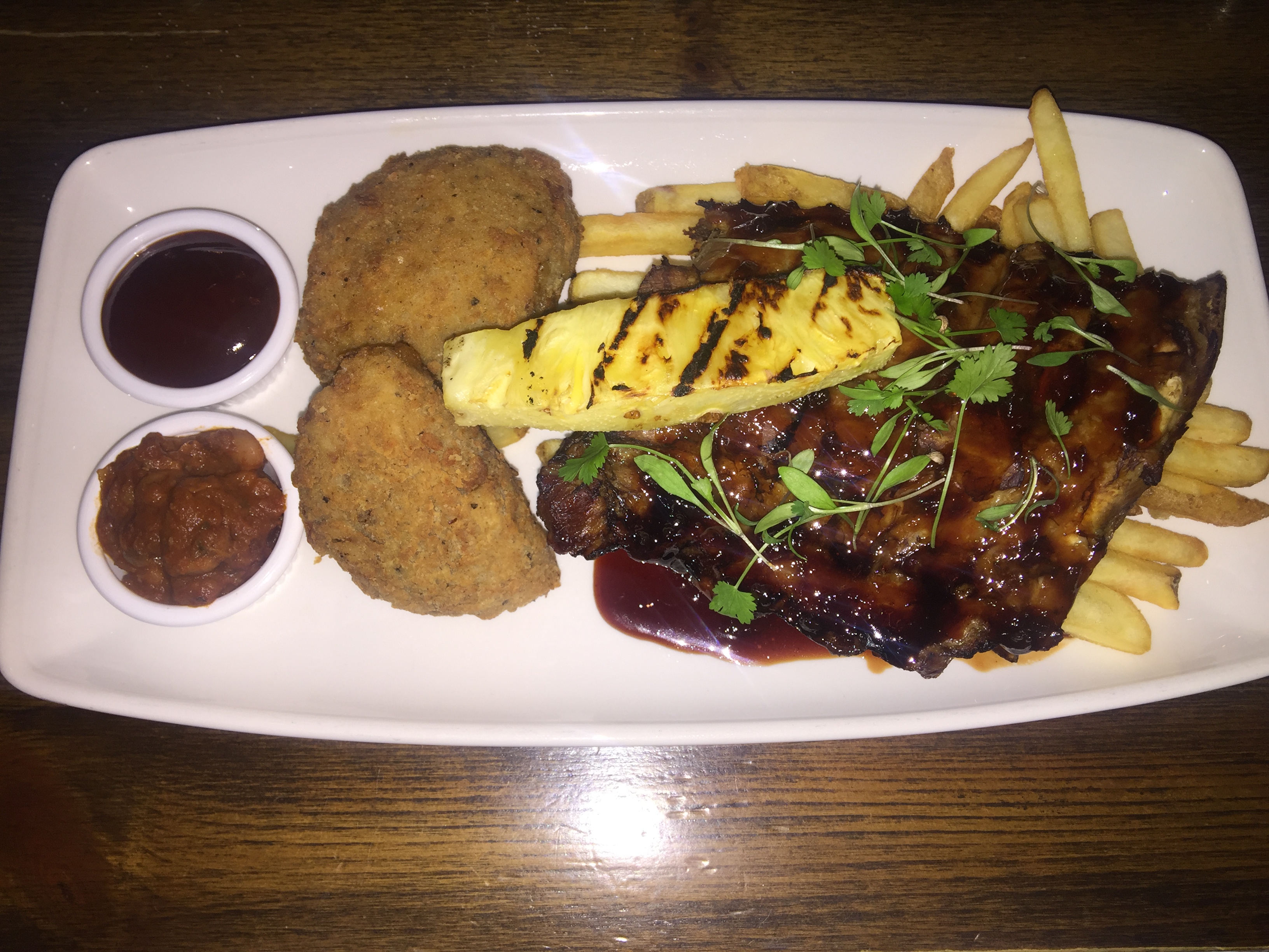 A group of pals and I headed down around 7pm, to have dinner, before taking in some live music. My companions were all vegetarian, but I followed the bar tender’s recommendation and went for the ‘2 Pieces of Fried chicken served with Bourbon Glazed Ribs. This was topped with grilled pineapple with BBQ pit beans and fries on the side. I played it safe and went for the BBQ sauce.