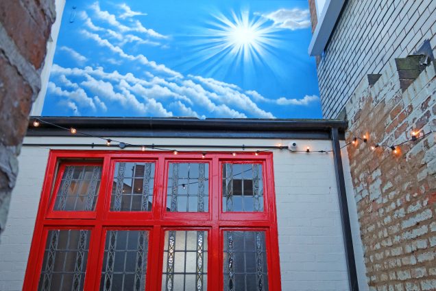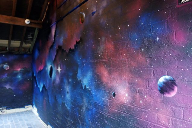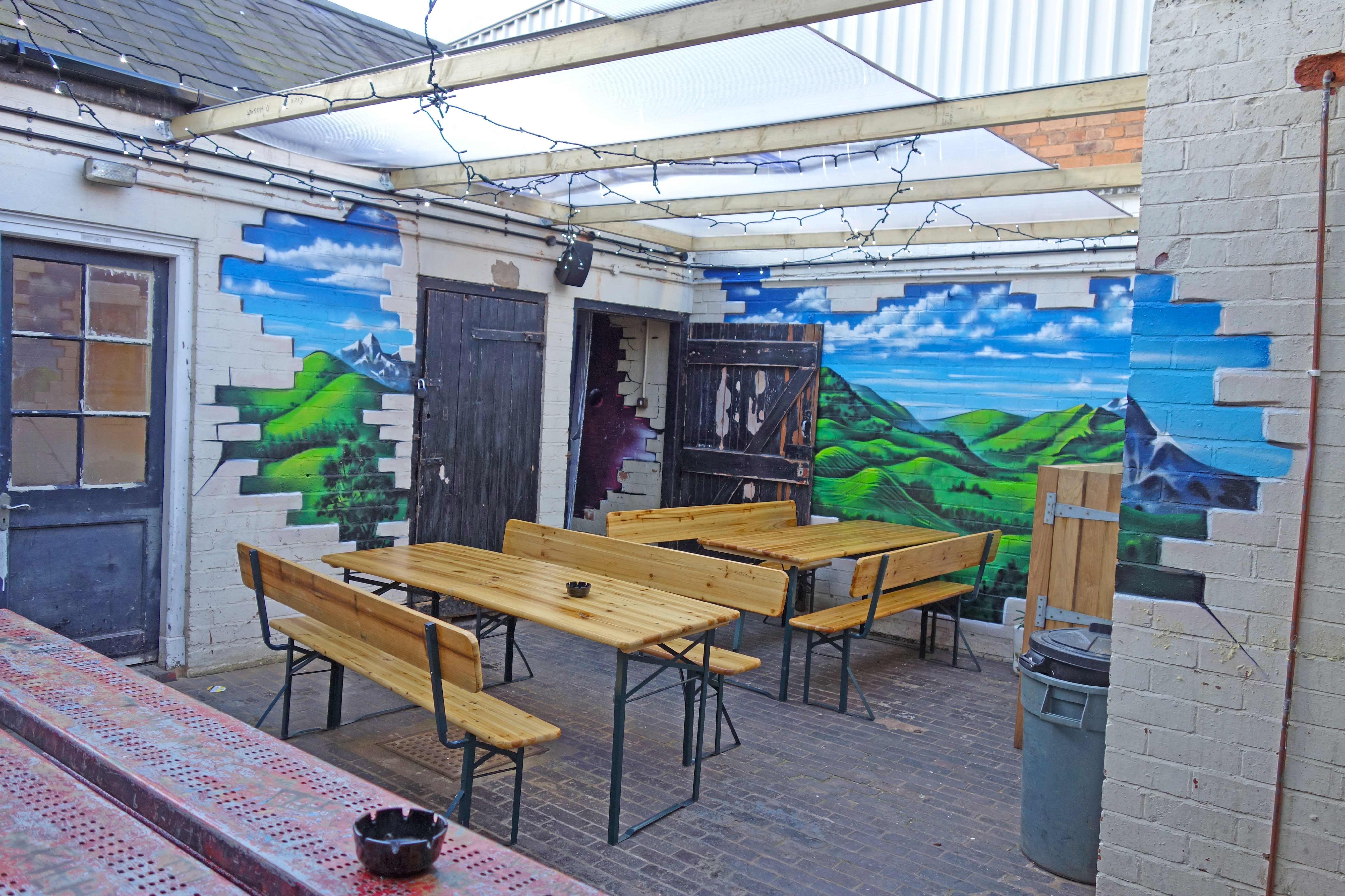 Outside the quirkiness continues with a medium sized beer garden, which is enclosed by walls covered in rural murals, but it doesn’t end there.. there’s a small covered area which is known as The Space Room, with interstellar graffiti, and another smaller yard with a huge blue sky mural on the rear of the building – ensuring the sun will always be shining on The Ruin.