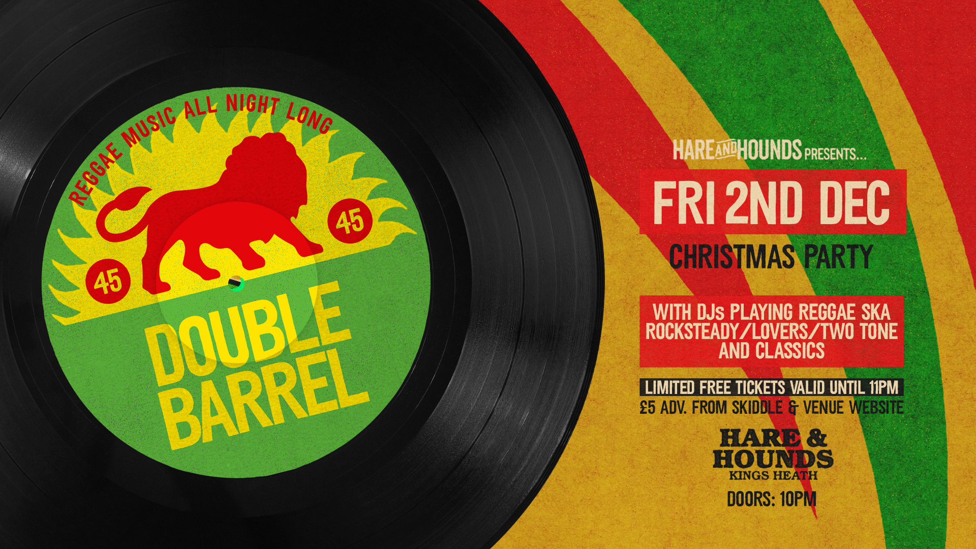 | Lobster Shack at Hare & Hounds, 106 High St, King’s Heath, Birmingham B14 7JZ Friday 2nd December Doors 7:30pm Standard Tickets £10 (plus booking fee) All Lobster Shack ticket holders will get free entry to the Double Barrel Reggae Christmas Party, with DJs spinning reggae, ska, rocksteady, lovers rock, two tone and classics until the early hours. |