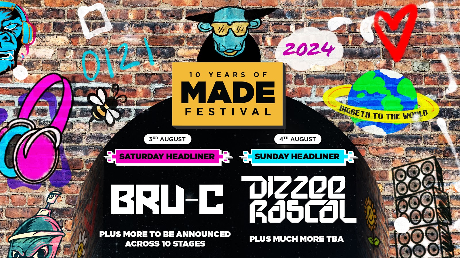 MADE Festival has announced its Saturday and Sunday headliners as it celebrates an incredible 10 years as the biggest and best festival of music and arts in the West Midlands. Saturday 3rd August sees the perpetually rising star and multi-platinum selling MC and rapper, Bru-C take over the MADE main stage. Then on Sunday 4th August it’s the turn of one of the most influential artists UK rap has ever seen – BRIT, MOBO and Mercury Prize-winning MC and rapper, Dizzee Rascal. MADE’s 10th celebrations kick off on Friday 2nd August for the 16+ crowds as the massive Super Sonix x MADE Festival collaboration returns – more details to follow. Back in its spiritual home of The Digbeth Triangle, MADE Festival 2024 will bring thousands of festival fans together for the party of the year. Tickets start at £45 from www.made-festival.co.uk.