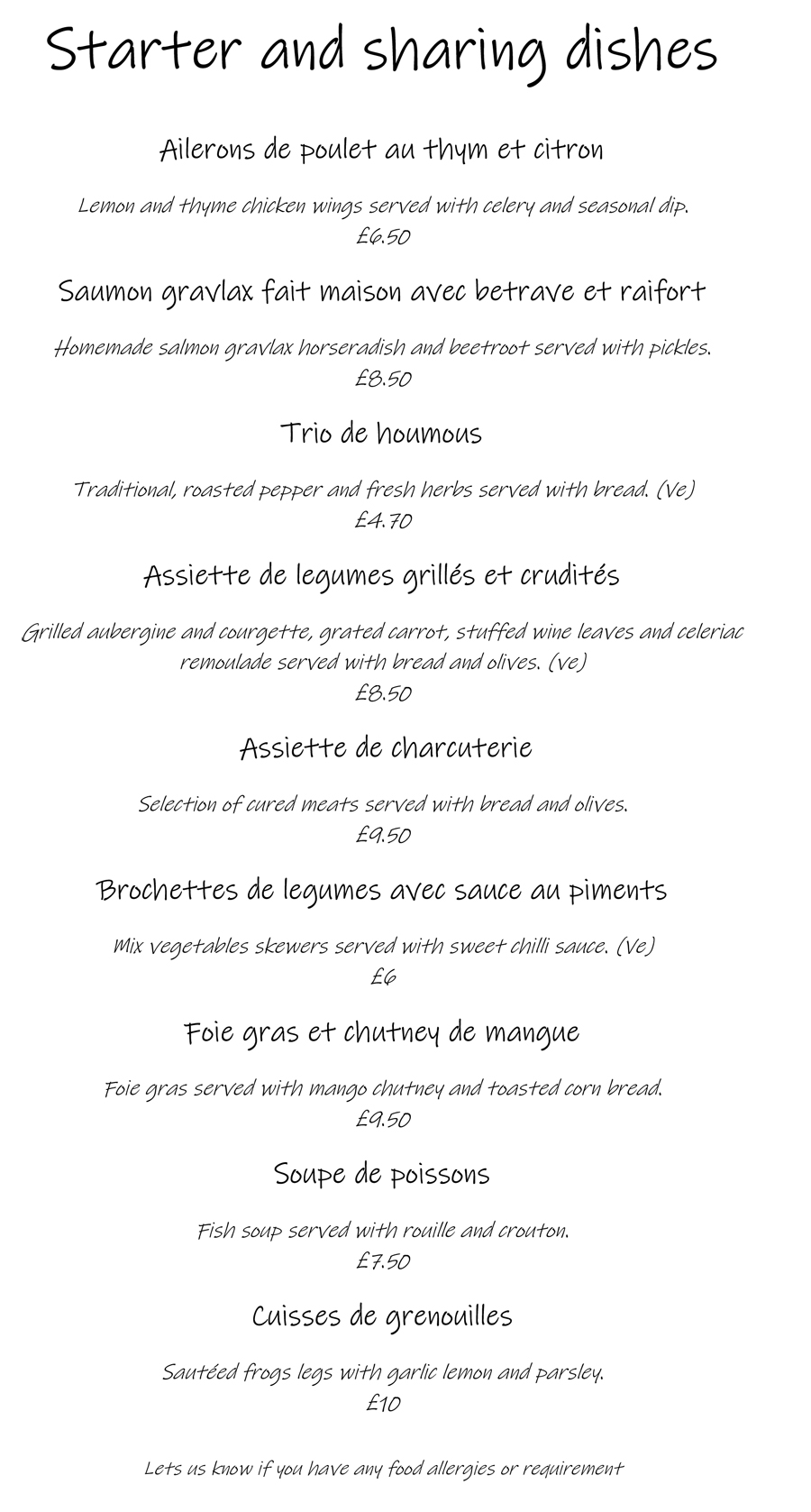 There’ll also be the French favourites that you’d expect – such as grilled vegetables and crudités, foie gras, charcuterie boards, soupe de poissons and frogs legs.