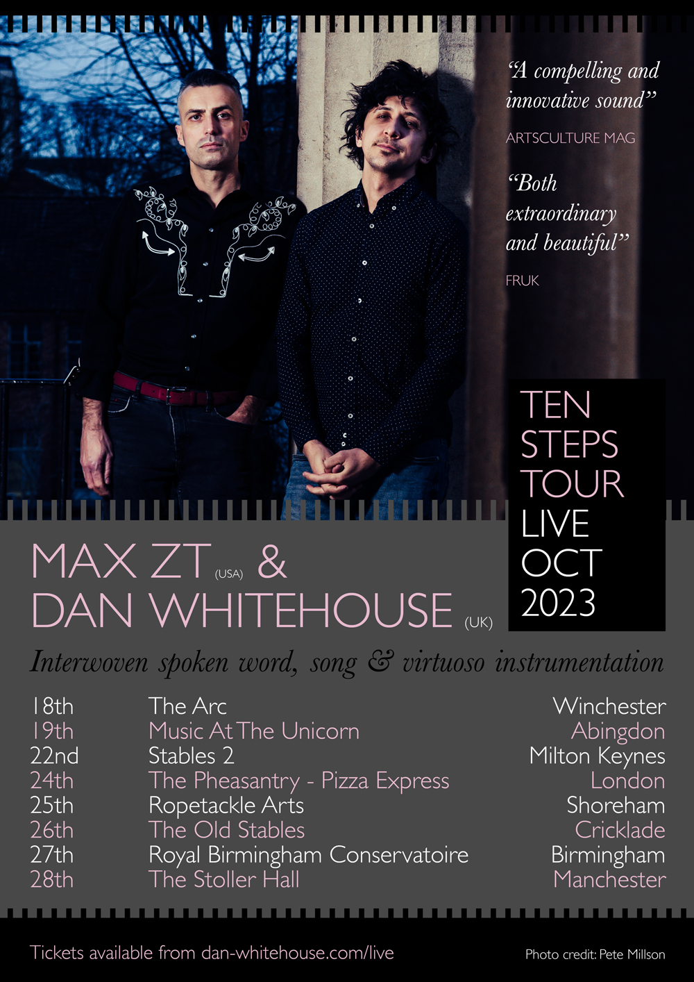Ten Steps is available now (vinyl and via streaming services). Max ZT and Dan Whitehouse visit Royal Birmingham Conservatoire, Birmingham, on Friday 27 October 2023. Tickets/ info via: bcu.ac.uk/conservatoire/