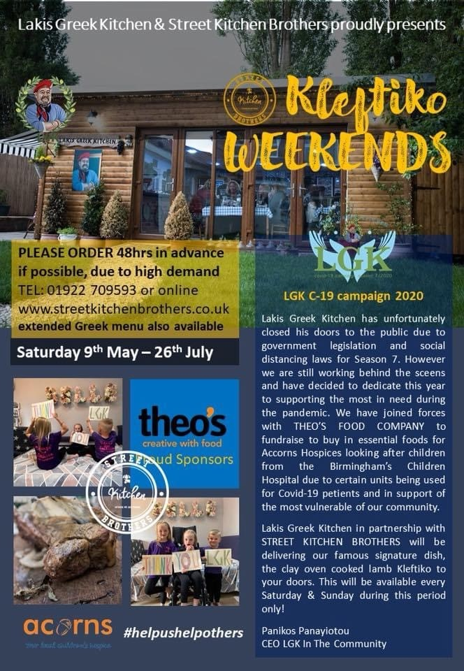 Lakis Greek Kitchen is an annual Greek Taverna based in the West Midlands, that raises money for good causes. Due to the pandemic LGK (as it is known) is unable to open its doors to the public this year in which would have been the 7th year running since the charity was established in 2014.