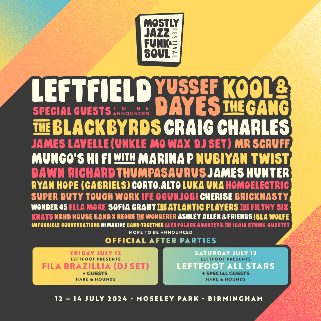 Leftfield, Yussef Dayes and The Blackbyrds are among the headline acts set to join the previously announced Kool and The Gang at Mostly Jazz Funk and Soul Festival (Friday 12 to Sunday 14 July 2024).