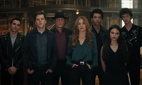 Incoming director Ruben Fleischer reignites the franchise after almost a decade, reuniting the estranged Four (and eventually five) Horsemen and adding a new trio of younger magicians to the mix for a film that seeks to do nothing but entertain. Set ten years on from the previous film the new illusionists are brash Bosco (Dominic Sessa), pickpocket June (Ariana Greenblatt) and quiet and shy Charlie (Justice Smith) who use deepfakes and holograms as wealth redistribution Robin Hoods who, following their latest trick, giving a crypto conman his comeuppance, are approached by only mildly less arrogant former Horseman Atlas (Jesse Eisengerg) who’s received a tarot card that’s led him to them so, working for The Eye, he can recruit them for a mission to steal the Heart, the world’s largest diamond. It’s currently owned by Veronika Vanderburg (Rosamund Pike relishing her villain role), the head of a South African diamond company which secretly launders money for arms dealers and criminals. The plan being to infiltrate the private party where it;s being exhibited and steal is by way of assorted disguises, props and misdirection. When things don’t go as smoothly as hoped, the four are rescued from their pursuers in a surprise appearance from the three other original Horsemen, mentalist Merritt McKinney (Woody Harrelson), card trickster Jack Wilder (Dave Franco) and escape artist Henley Reeves (Isla Fisher), all of whom also received mysterious Tarot cards.