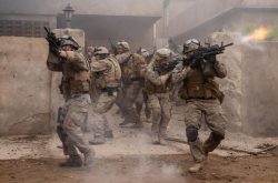 The tension is palpable as, learning air support will be temporarily available and seeing the local gunmen massing, you wait for some 30 minutes before the inevitable arrives, here manifesting in a grenade tossed through a window. Getting a fighter plane to demonstrate a ‘show of force’ and stir up dust clouds, Erik calls in an armoured Bradley for a CasEvac of Elliott under cover of a smoke canister, but an IED explodes, eviscerating one of the translators and leaving Sam and Elliott with grotesque wounds to their legs. When Alpha Two, the ‘frogmen’, finally make it inside, they’re still pinned down by gunmen on the rooftops and, their superiors refusing to send other vehicles only for them to be destroyed, Jake get his radio op to impersonate a CO to call for two more Bradleys. It’s just a matter as to whether they can survive in the time it will take them to arrive.