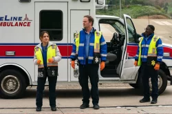 Breaking through the fourth wall as he talks direct to camera, the night will see the crew attending a multiple fatality car crash, a half-naked mentally ill homeless man screaming about how he’s “Satan and his only messenger”, so he can get a hot meal, being vomited on and attacked by someone they’ve just saved from an overdose, being threatened by a deranged woman with a gun, being patronised and insulted by overworked asshole Dr. Serano (Rob Riggle) and Mike calming down a psychotic Black veteran with PTSD shouting how he’s the President before a couple of trigger happy cops shut him up for good.